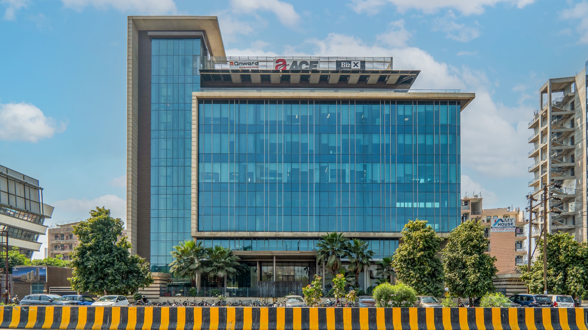 ACE Studio in Sector 126, Noida, is a sleek corporate landmark defined by its expansive glass façade and modern architectural lines. The building features a high-performance blue curtain wall system that wraps the main volume, ensuring maximum natural light and thermal efficiency. Anchored by a solid vertical stone-clad core and capped with a distinctive floating roof plane, the design balances transparency with structural solidity to create a premier professional environment.