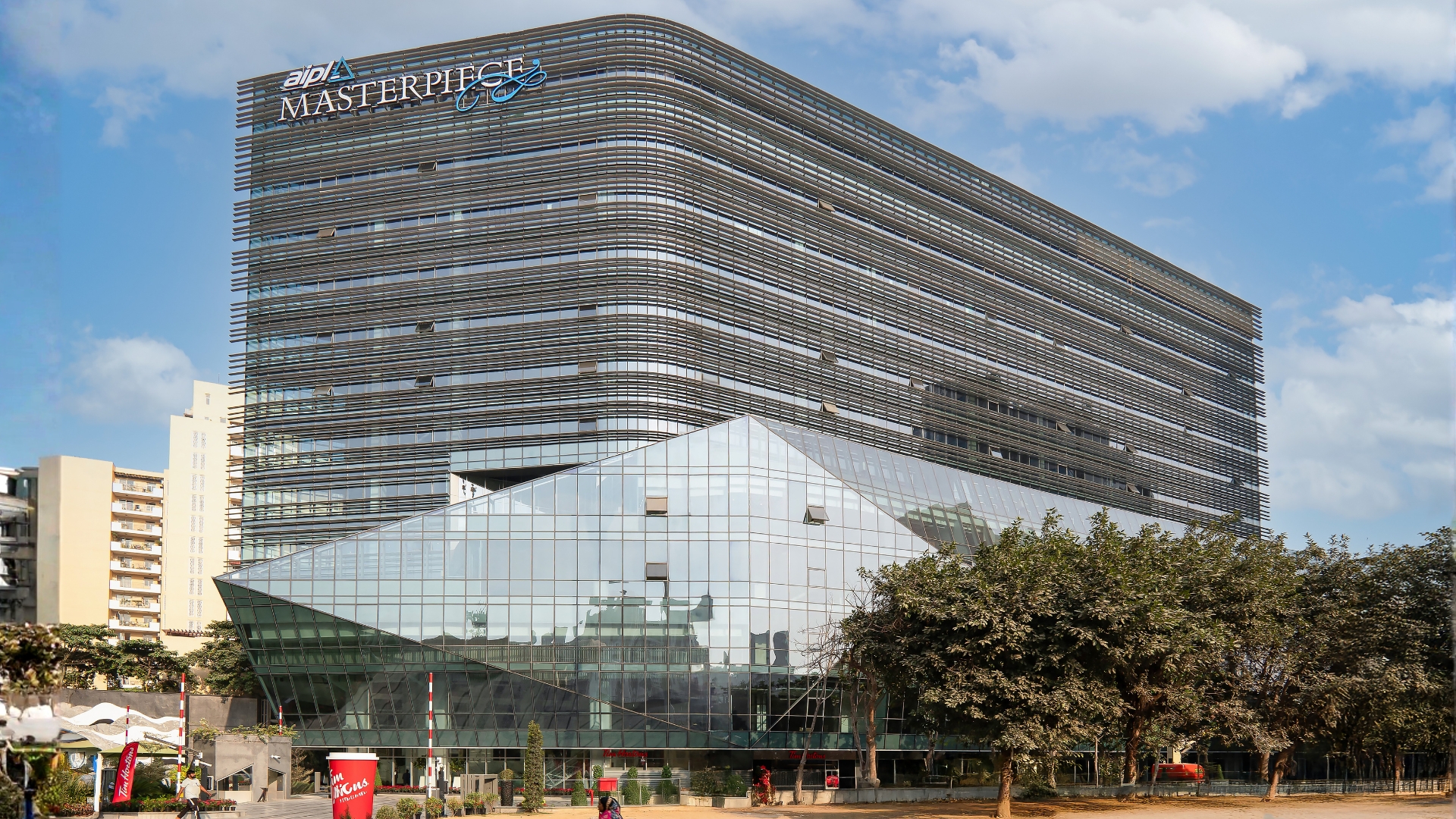 AIPL Masterpiece in Sector 54, Gurgaon, is a landmark commercial development defined by its sophisticated layering and functional aesthetics. The main tower is wrapped in a continuous screen of horizontal aluminum louvers that provide critical solar shading while creating a rhythmic, textured visual. Contrasting this is a dramatic, angular crystalline glass volume at the base—often referred to as an origami-inspired structure—that houses the retail and lobby spaces, offering a striking interplay between solid geometry and transparent fluidity.
