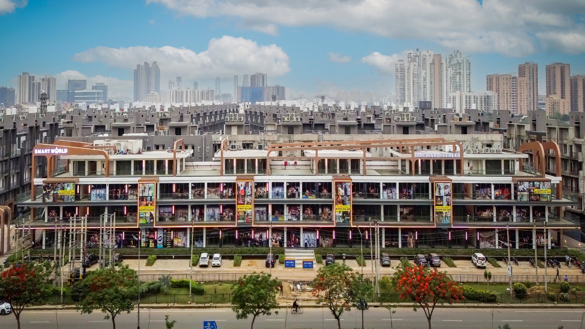 Smartworld in New Delhi is a vibrant high-street retail destination defined by its rhythmic architectural language and open-air design. The façade is characterized by a series of repeating terracotta-hued arched frames that create a distinctive visual identity and scale. Featuring tiered levels connected by external escalators, the complex utilizes expansive storefront glazing and seamless glass balustrades to maximize retail visibility and create an engaging, transparent shopping experience.