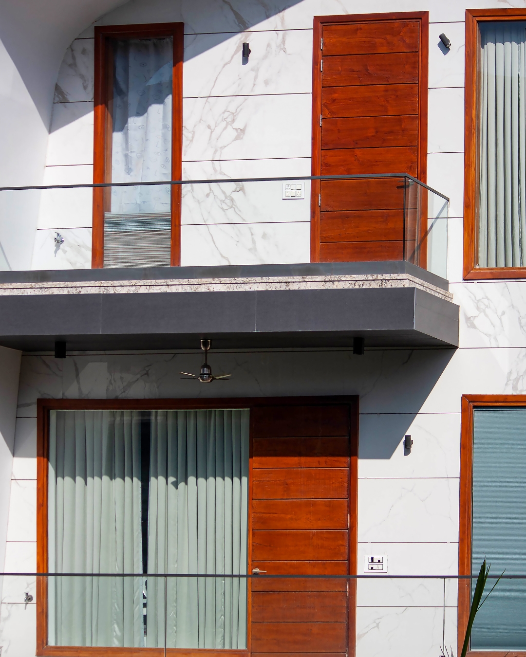 Located in the bustling neighborhood of Mianwali Nagar, Delhi, this private residence is a stunning example of modern urban architecture. The facade makes a bold statement with its contemporary white cladding, beautifully offset by warm wooden textures and striking curved architectural lines that frame the exterior. The design seamlessly integrates large, premium windows and sliders that allow abundant natural light to flood the interior spaces while ensuring a sleek aesthetic. Furthermore, the minimalist frameless glass railings on the balconies add a touch of modern elegance, ensuring unobstructed views alongside safety. This property stands as a testament to sophisticated design, offering a perfect blend of luxury, functionality, and visual appeal in the heart of West Delhi.