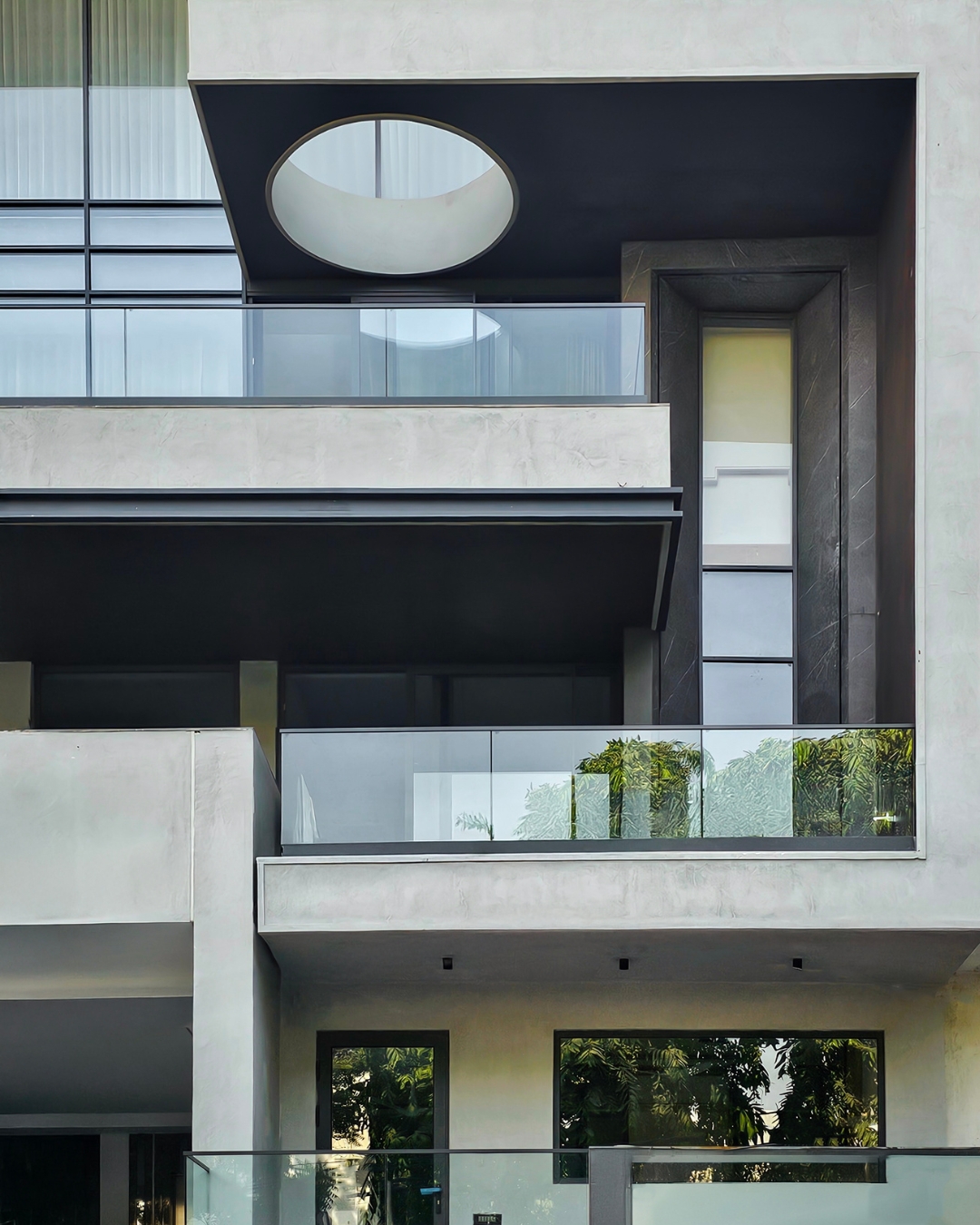 C2-107 in New Delhi is a contemporary residence defined by its stacked geometric volumes and striking architectural gestures. The façade features a pristine white cantilevered frame punctuated by a dramatic circular cutout (oculus), creating a dynamic play of light and shadow. Anchored by a vertical grey stone spine and equipped with expansive curtain wall glazing and seamless glass balustrades, the design seamlessly blends modern transparency with structural boldness.