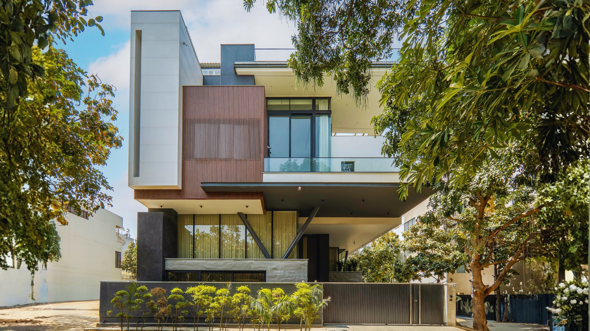 D-1/9 DLF Phase 1 in Gurugram is a modern architectural statement defined by its gravity-defying structure and warm material contrast. The façade is dominated by a dramatic cantilever supported by striking V-shaped steel columns, creating a dynamic floating effect. Complemented by vertical timber-finish screens and smooth white planes, the residence utilizes expansive floor-to-ceiling glazing and seamless glass balustrades to open the living spaces to the surrounding greenery while maintaining a sharp, contemporary edge.