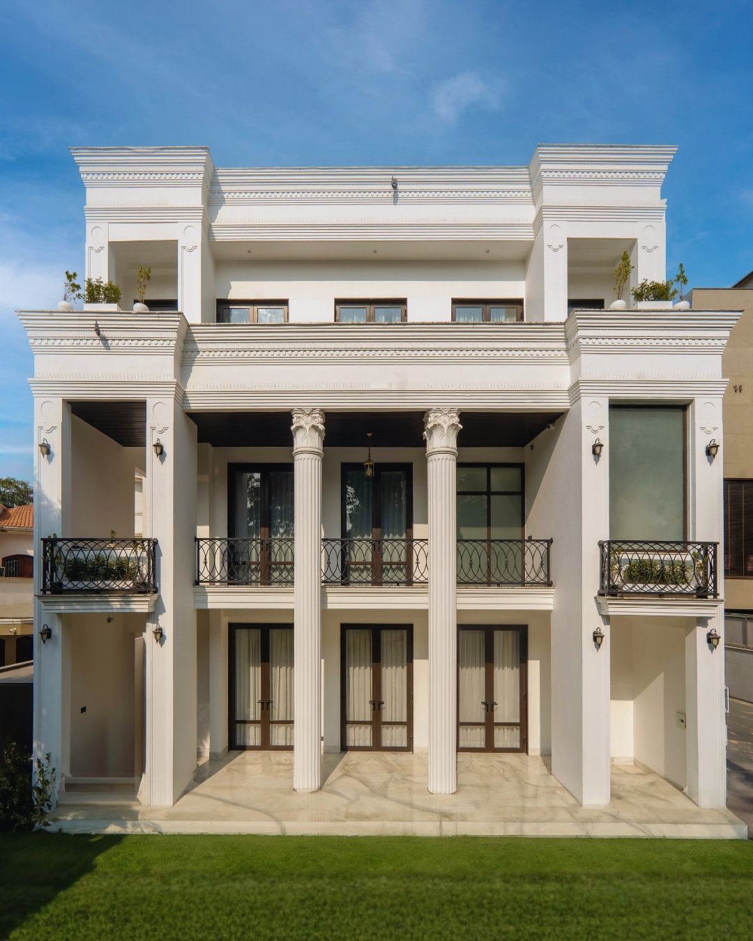 K-1569 Palam Vihar in Gurgaon is a palatial residence that seamlessly blends Neoclassical opulence with modern interior sophistication. The majestic façade is defined by soaring Corinthian columns, intricate moldings, and a pristine white palette, punctuated by contrasting dark-framed French windows. Inside, the design transitions into a realm of bespoke luxury, featuring intricate fluted glass partitions and expansive sliding systems that open up to a private pool deck, creating a harmonious balance between classical grandeur and contemporary living.