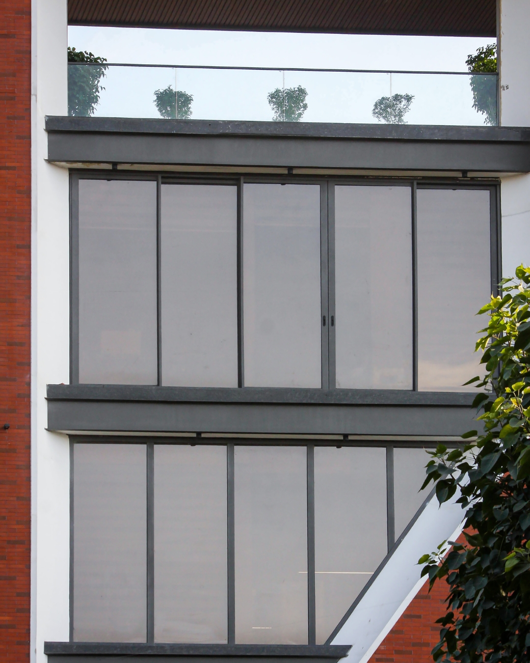 Tattvam at A-17 Pushpanjali Enclave is a striking residential landmark defined by its bold, angular geometry and warm material contrast. The façade features a dynamic diagonal slice that divides the elevation, framing the balconies with a continuous white ribbon against a textured brick-red backdrop. Enhanced by expansive dark-framed glazing and sleek metal accents, the design creates a powerful visual narrative that is both modern and architecturally distinct.